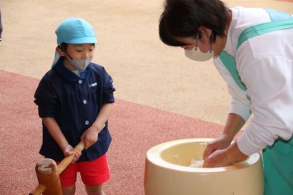 ぞうぐみの子ども達は一人一回ずつ餅つきを体験しました。🪵🔨⚪🍊